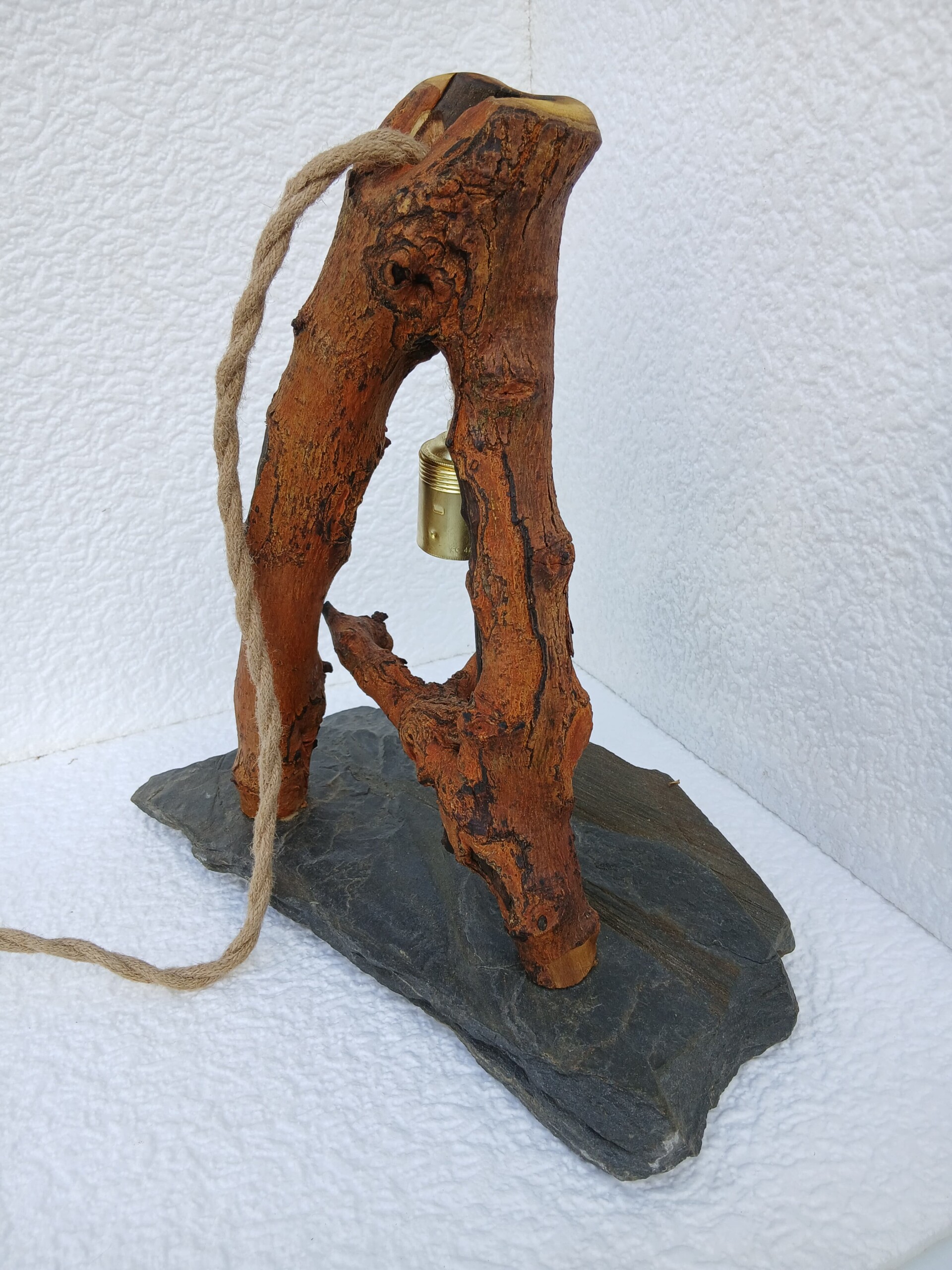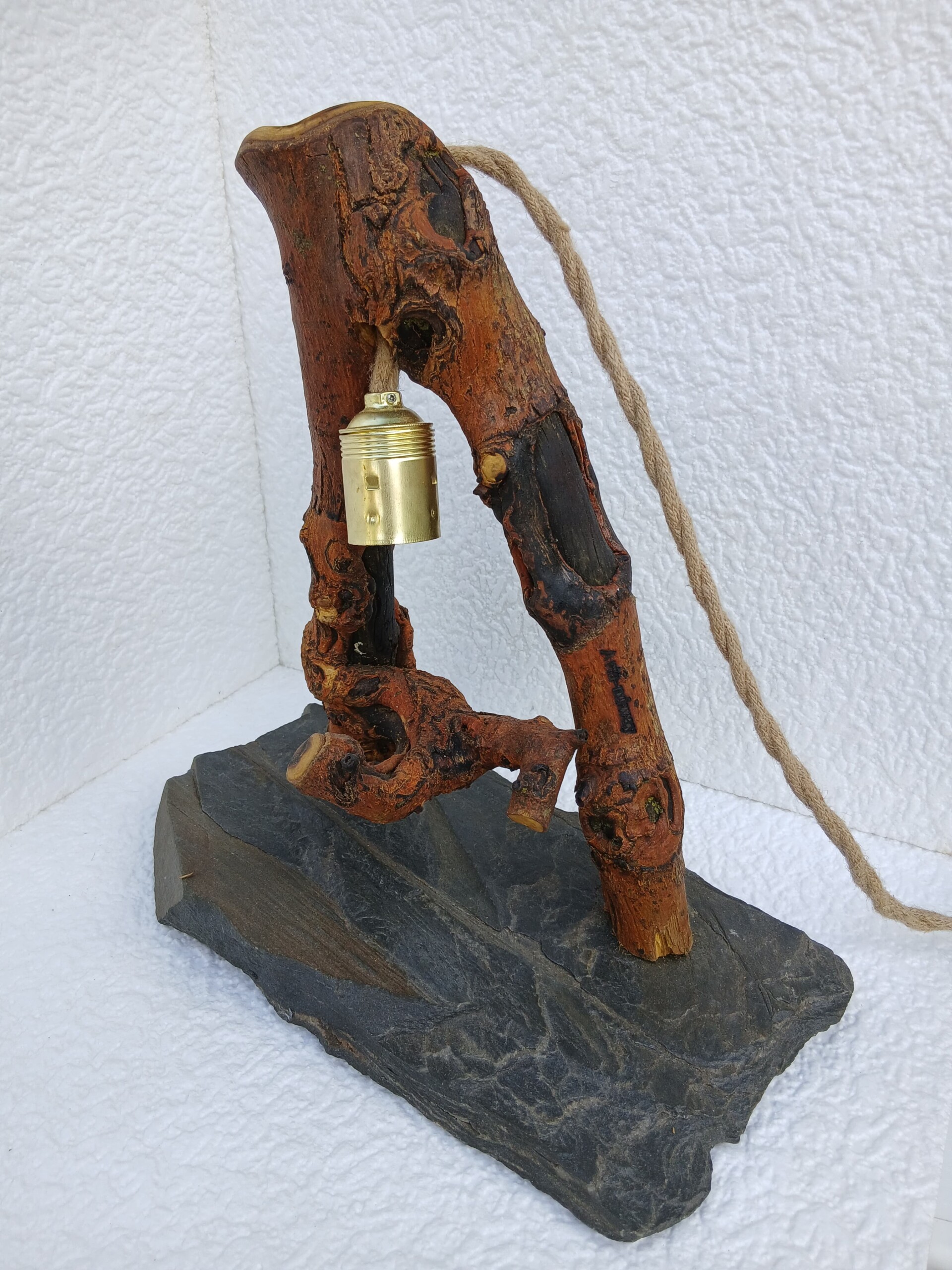 Esta lámpara tiene el encanto salvaje de un tesoro encontrado en medio del bosque y transformado en luz. Su estructura principal está compuesta por una pieza de madera retorcida con nudos, curvas y cicatrices. La forma que adopta es casi triangular como un refugio natural donde se protege la bombilla.