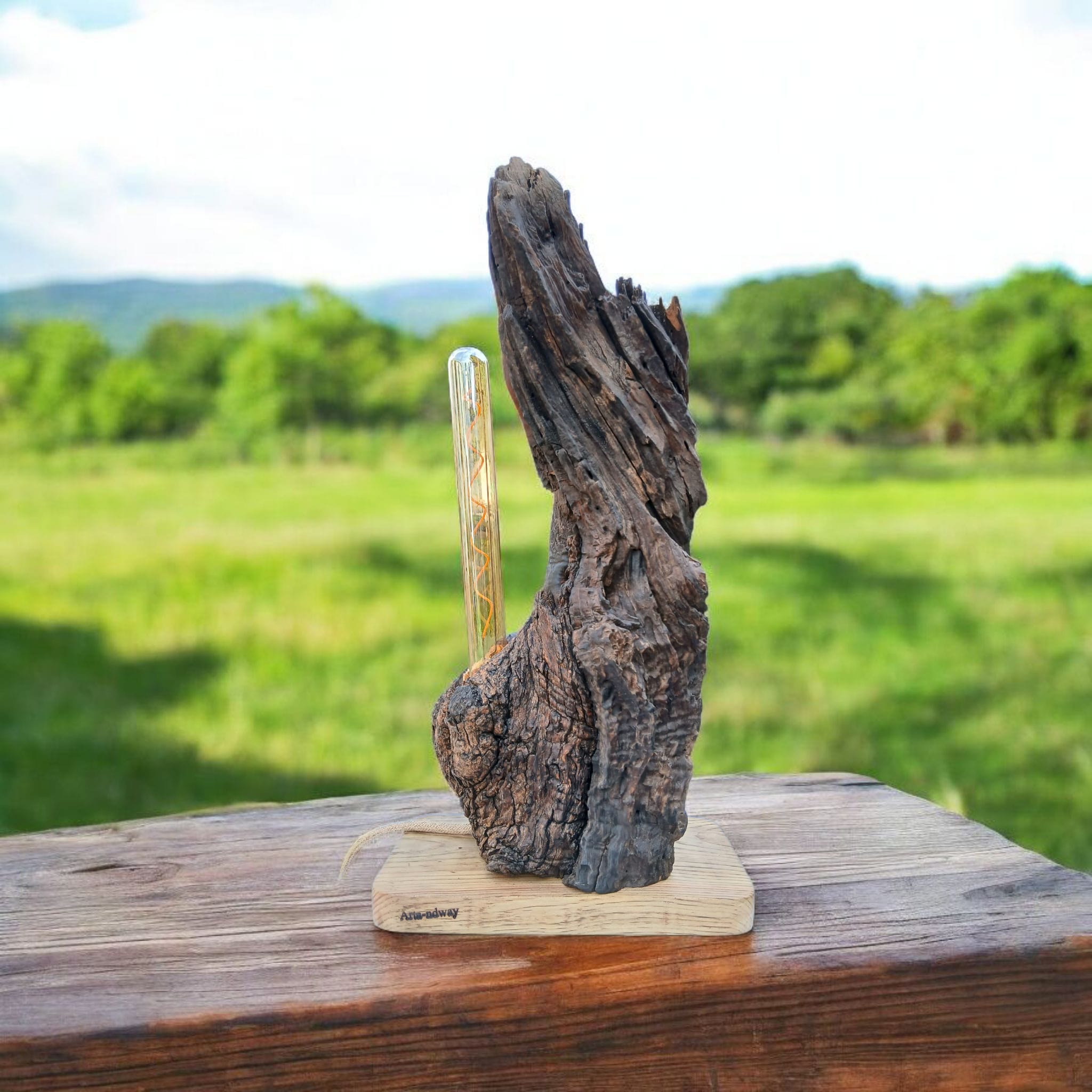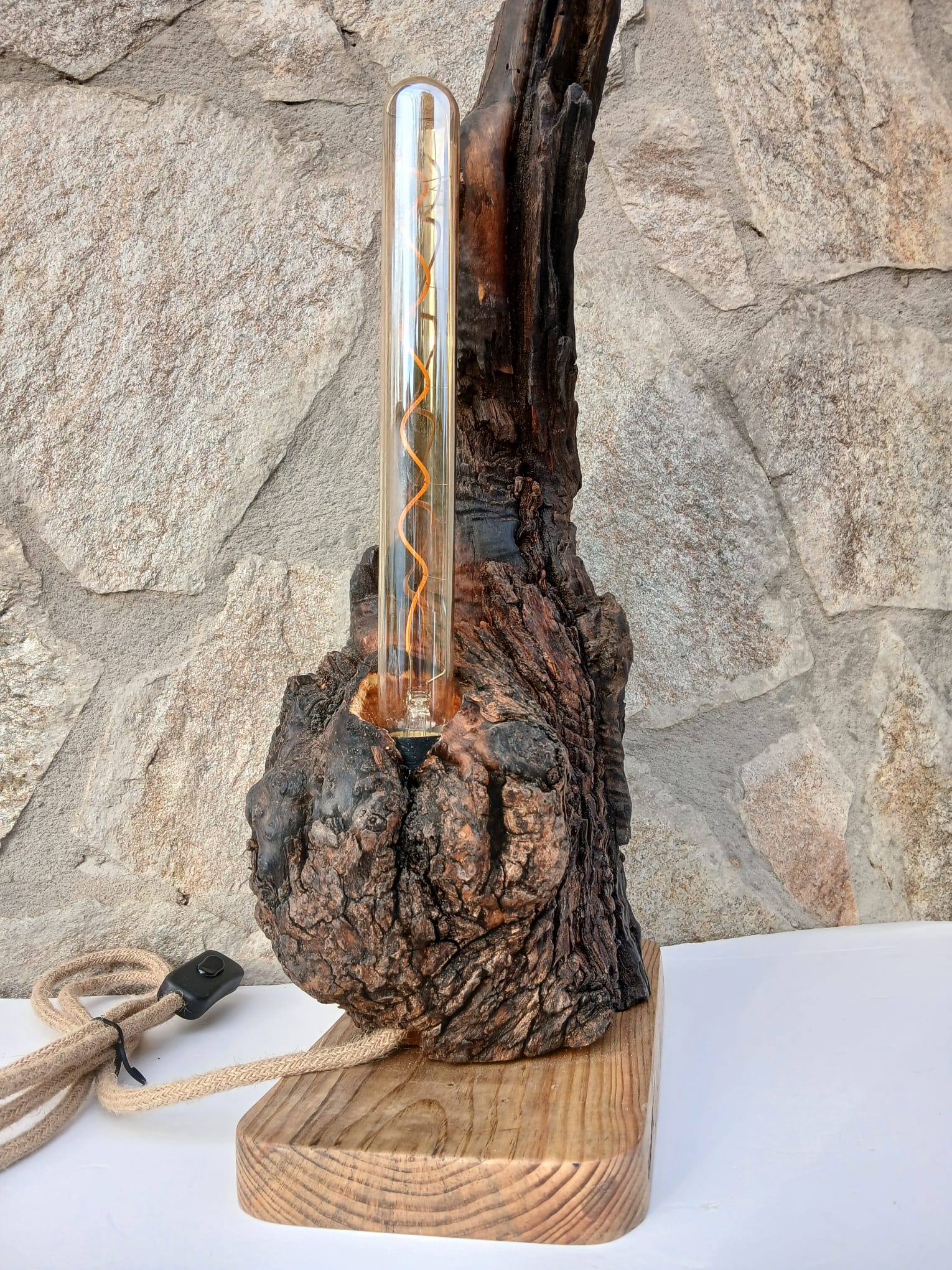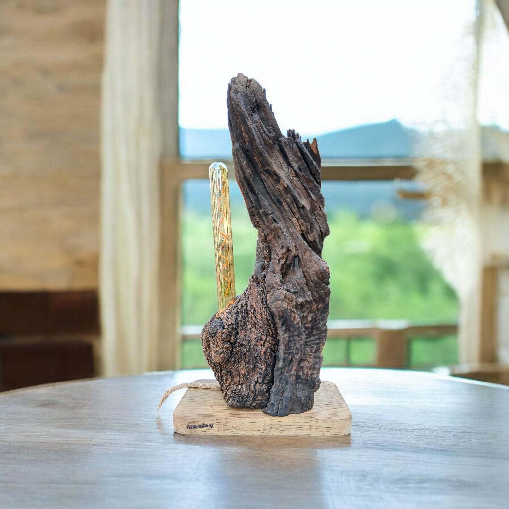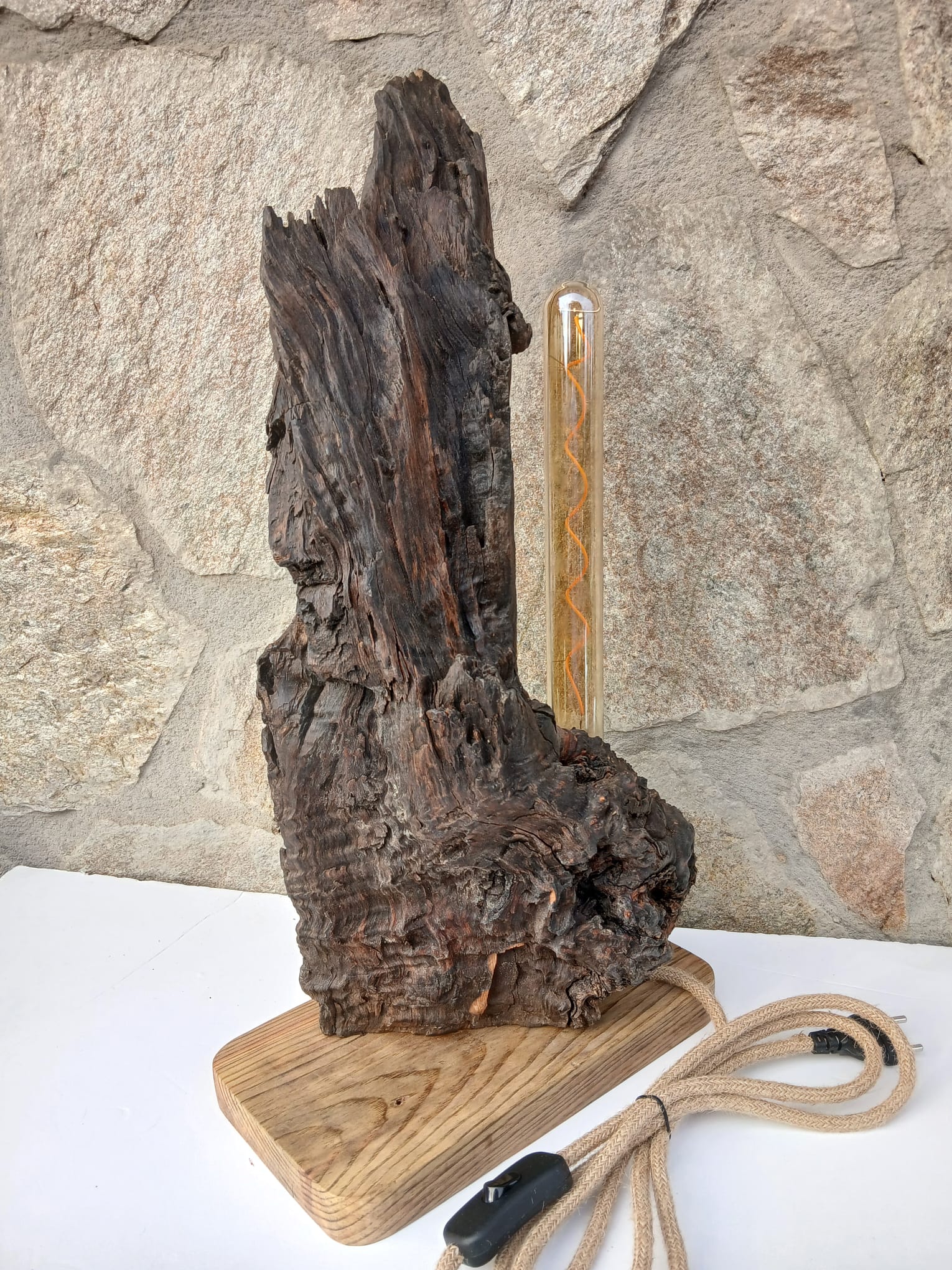 Es una lámpara artesanal de madera de olivo con carácter, que destaca por la belleza natural de su forma y de su textura oscura. Es un fragmento de la naturaleza antigua que ilumina y decora.