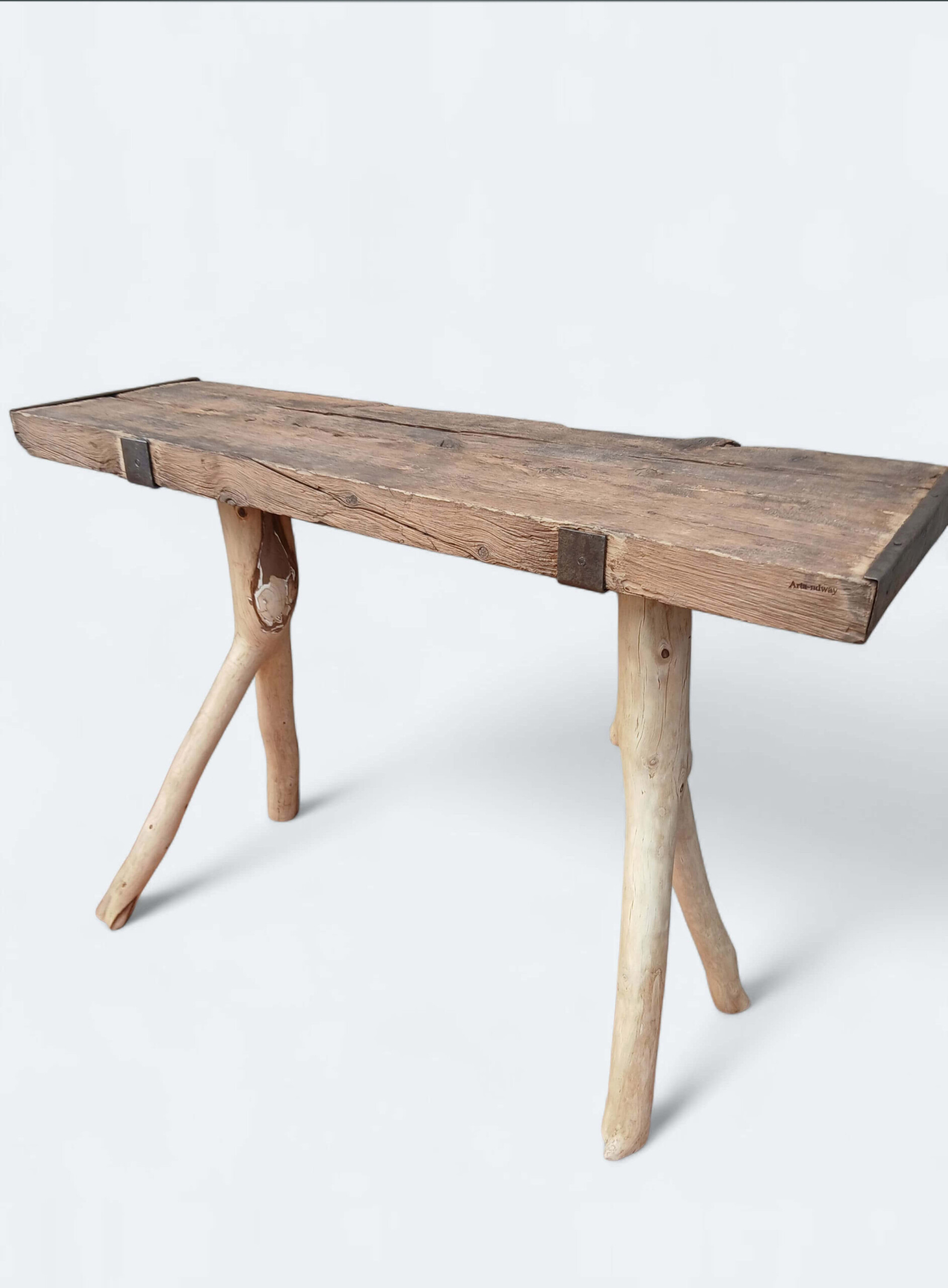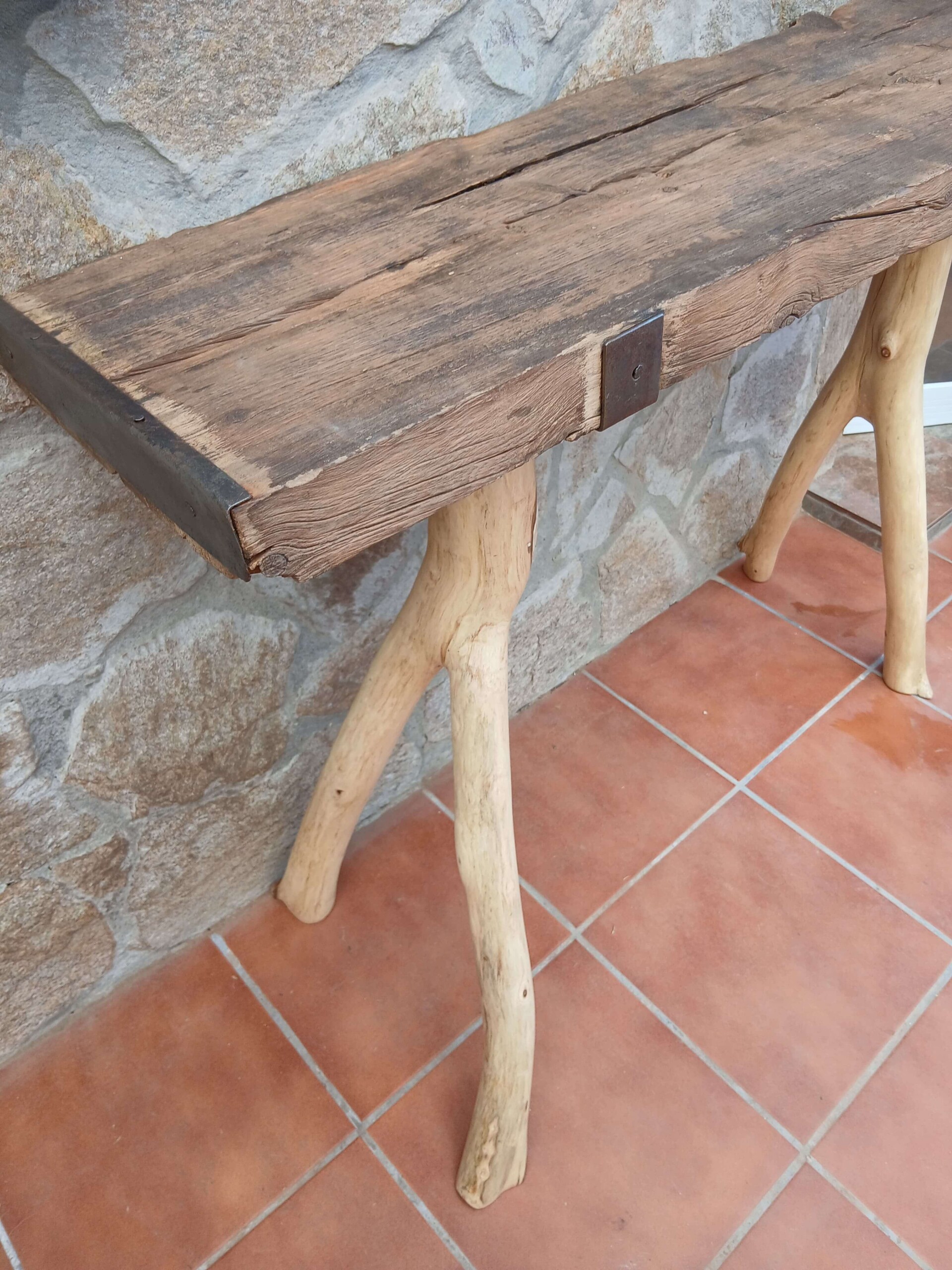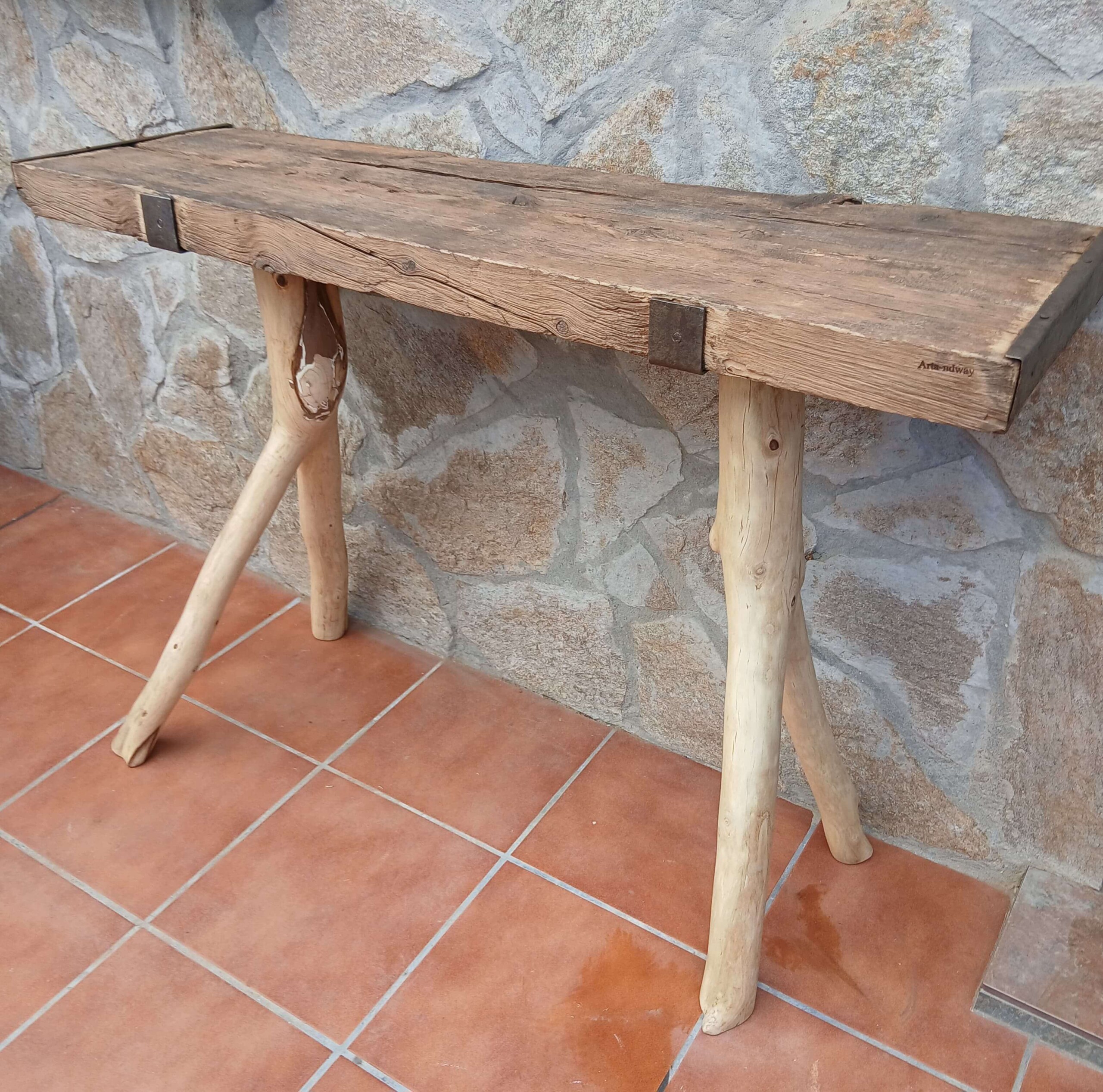 Mesa consola rústica construida con madera de antiguas vigas de techo, ramas de árbol de poda y piezas metálicas con efecto oxido.