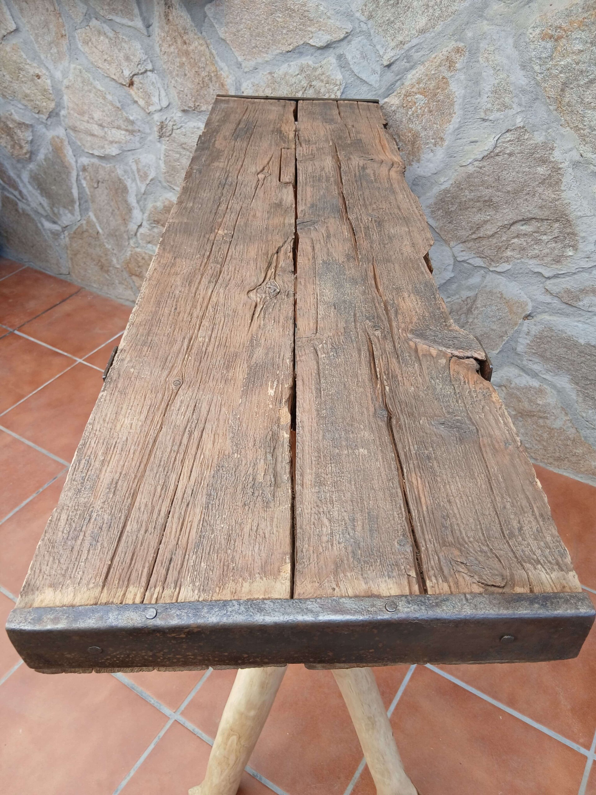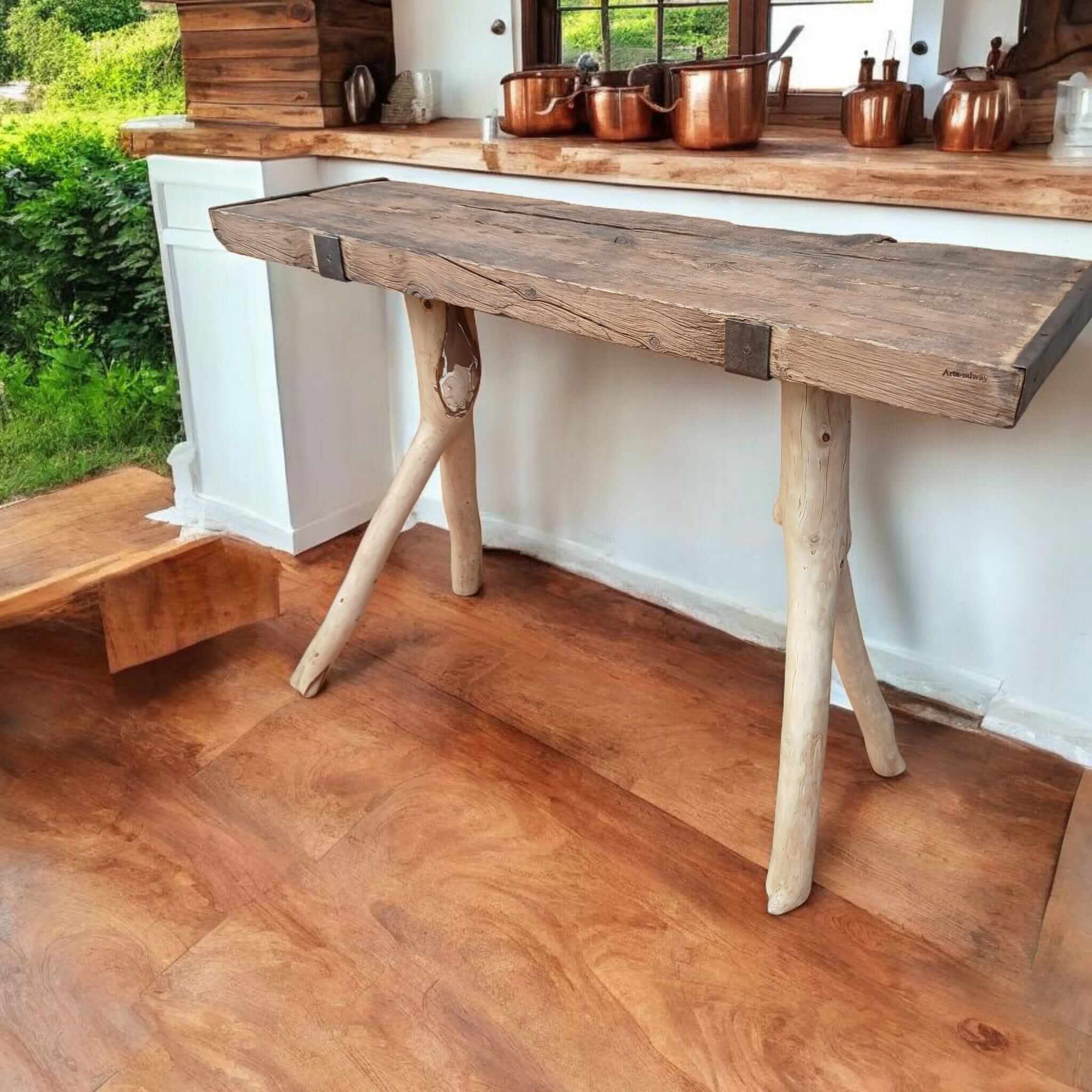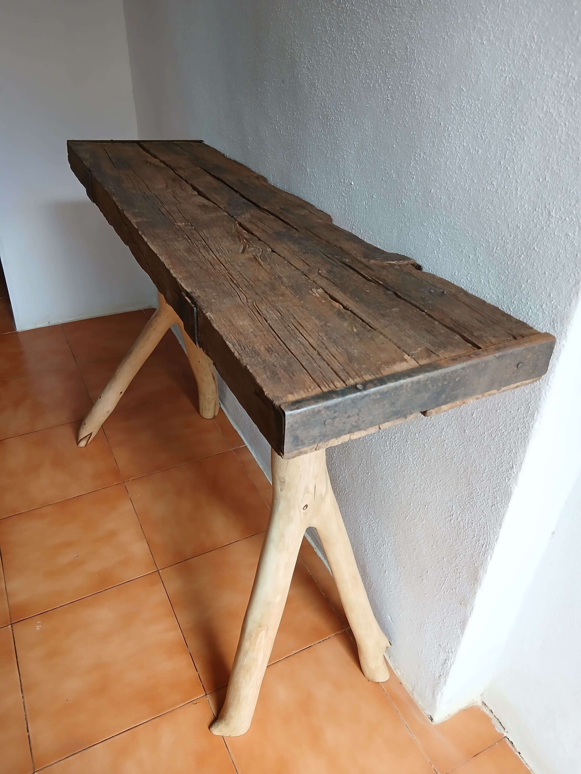 Mesa consola rústica construida con madera de antiguas vigas de techo, ramas de árbol de poda y piezas metálicas con efecto oxido.