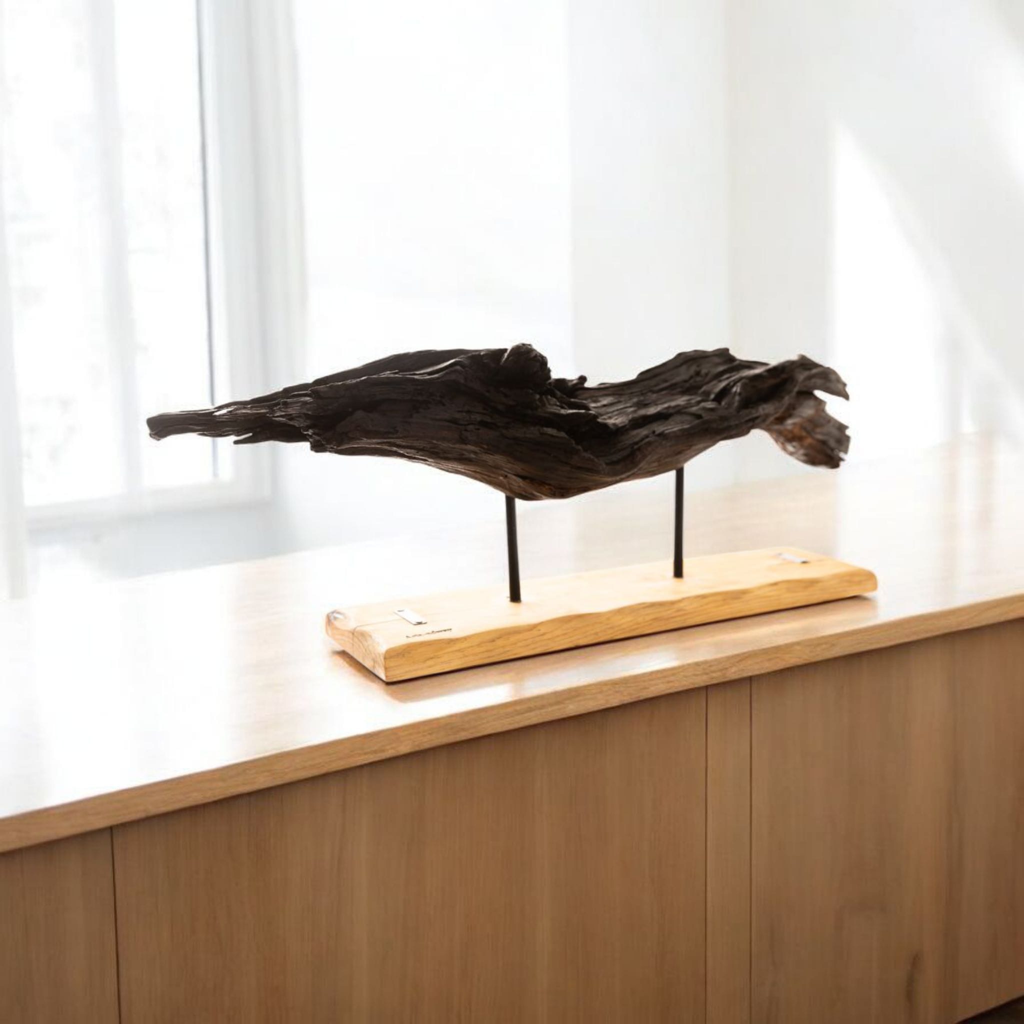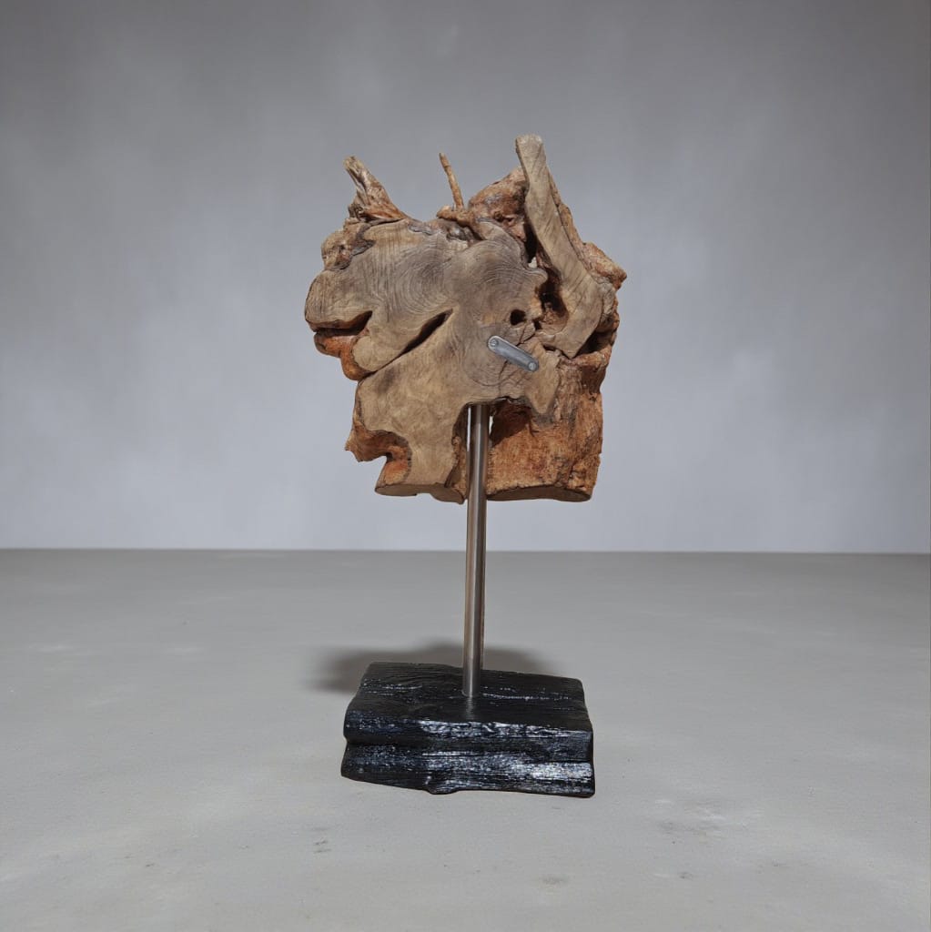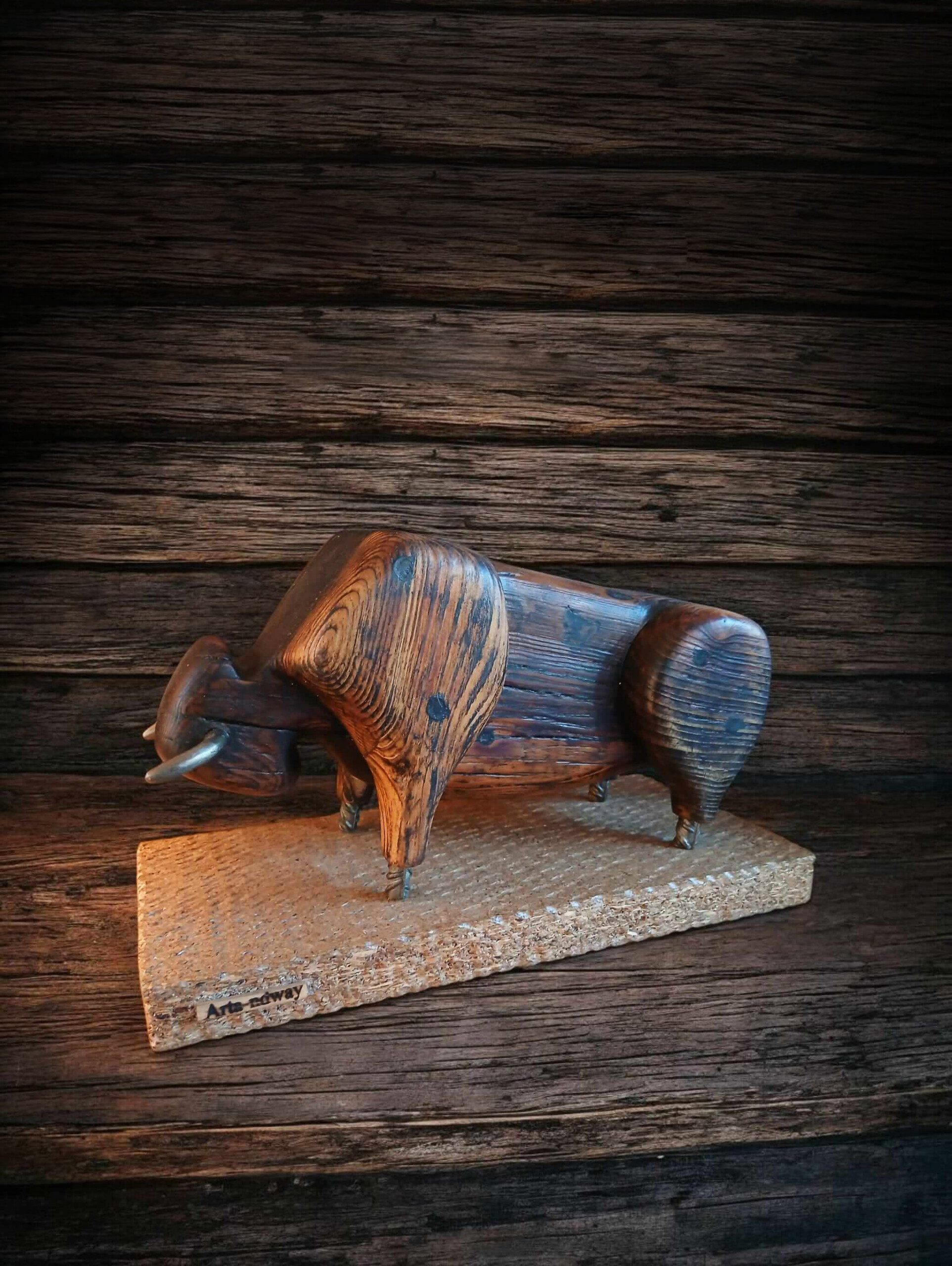 Figura decorativa artesanal construida con madera de olivo tallada y metales moldeados a semejanza de un bisonte.