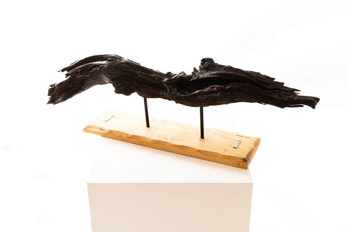 La pieza principal de esta escultura es una rama oscura y retorcida con una textura rugosa y formas irregulares que evocan movimiento.