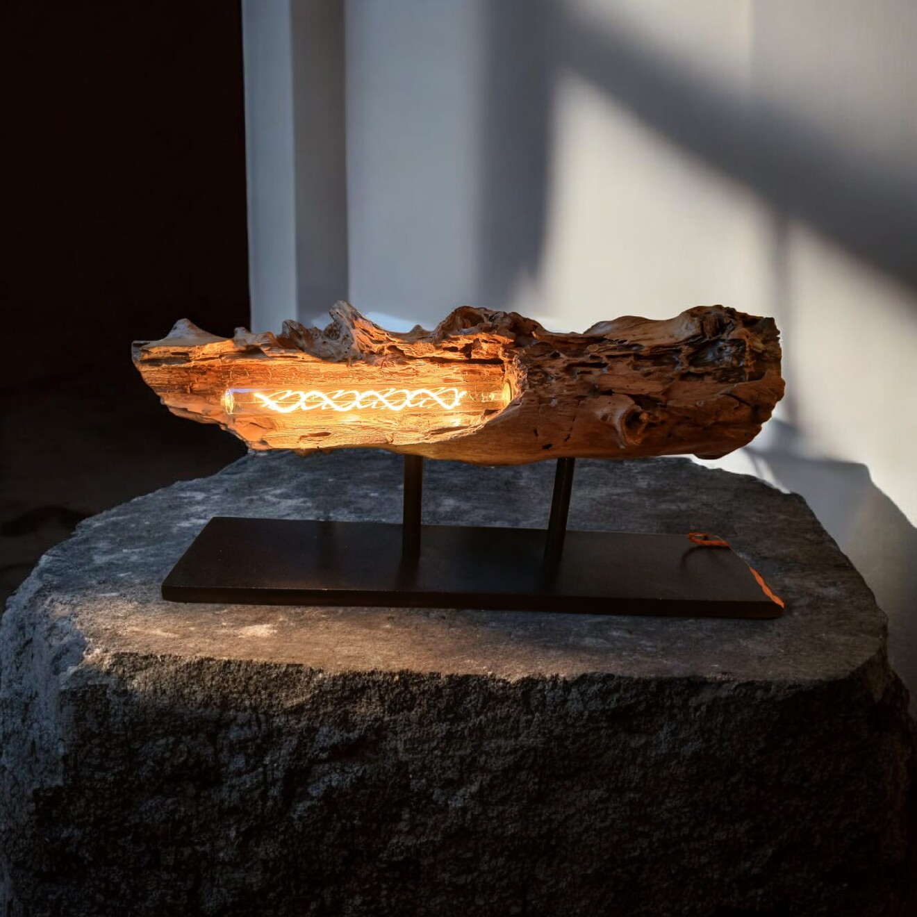 - Está montada en una base de madera clara y lisa que contrasta elegantemente con el tono oscuro de la pieza.