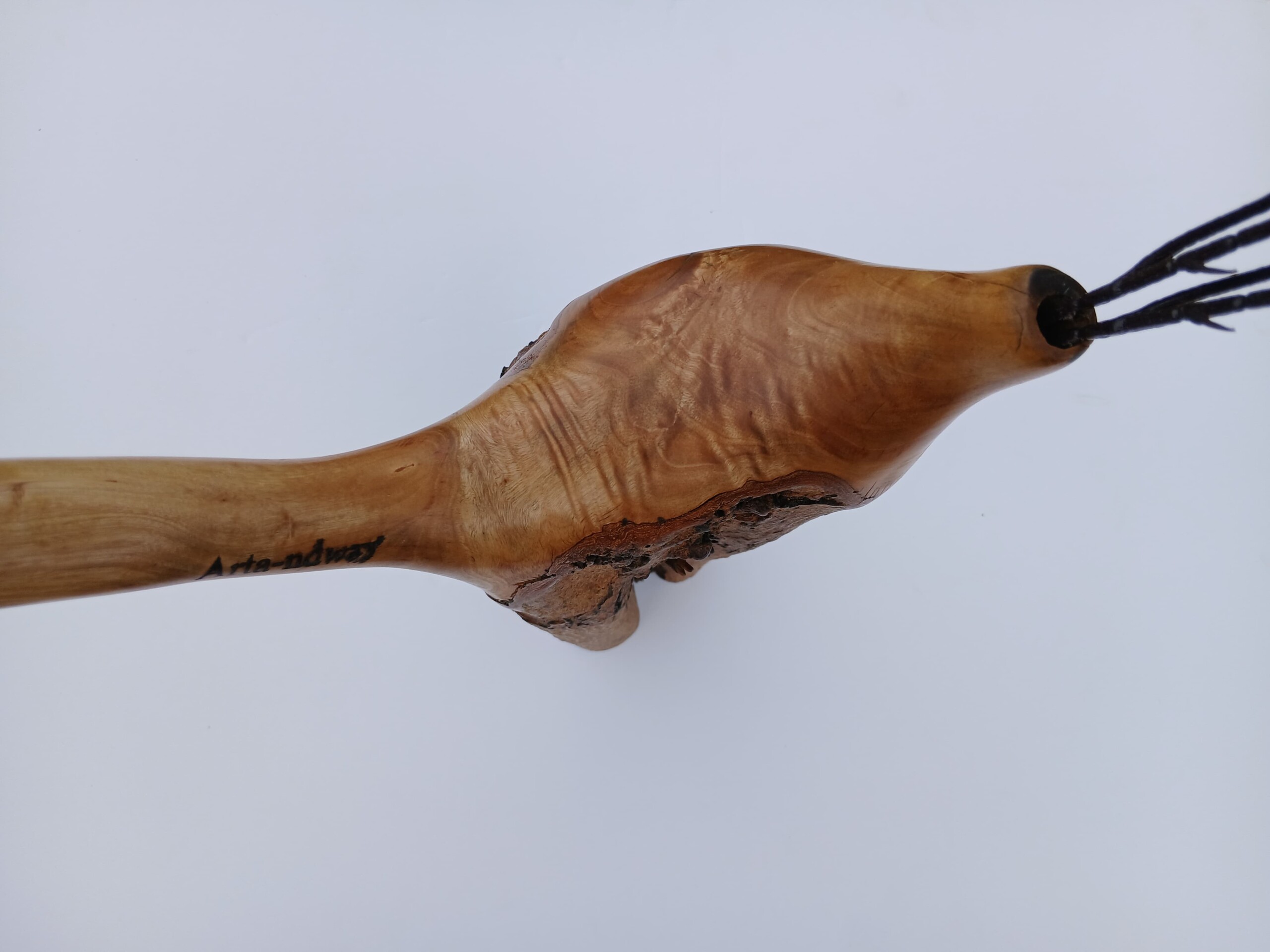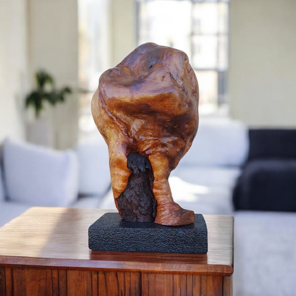 La pieza conserva la esencia del tronco original con una textura viva donde se mezclan la suavidad de la madera pulida con la rudeza de sus nudos y cavidades.